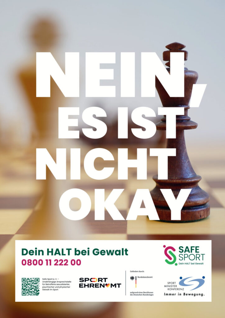 Safe Sport e.V. ist die unabhängige Beratungsstelle gegen Gewalt, Machtmissbrauch und sexualisierte Übergriffe im Sport. Die Ansprechstelle bietet Betroffenen kostenlose, vertrauliche Beratung, persönlich, online oder telefonisch unter der Nummer 0800 11 222 00. Hier erhalten Betroffene, aber auch Vereine, wertvolle Tipps von Experten und Expertinnen im Bereich Psychologie und Recht. Außerdem gibt es die vielbeachtet Plakat-Kampagne „Nein, es ist nicht okay“ für mehrere Sportarten. Schach fehlte bisher, aber das hat sich jetzt geändert.